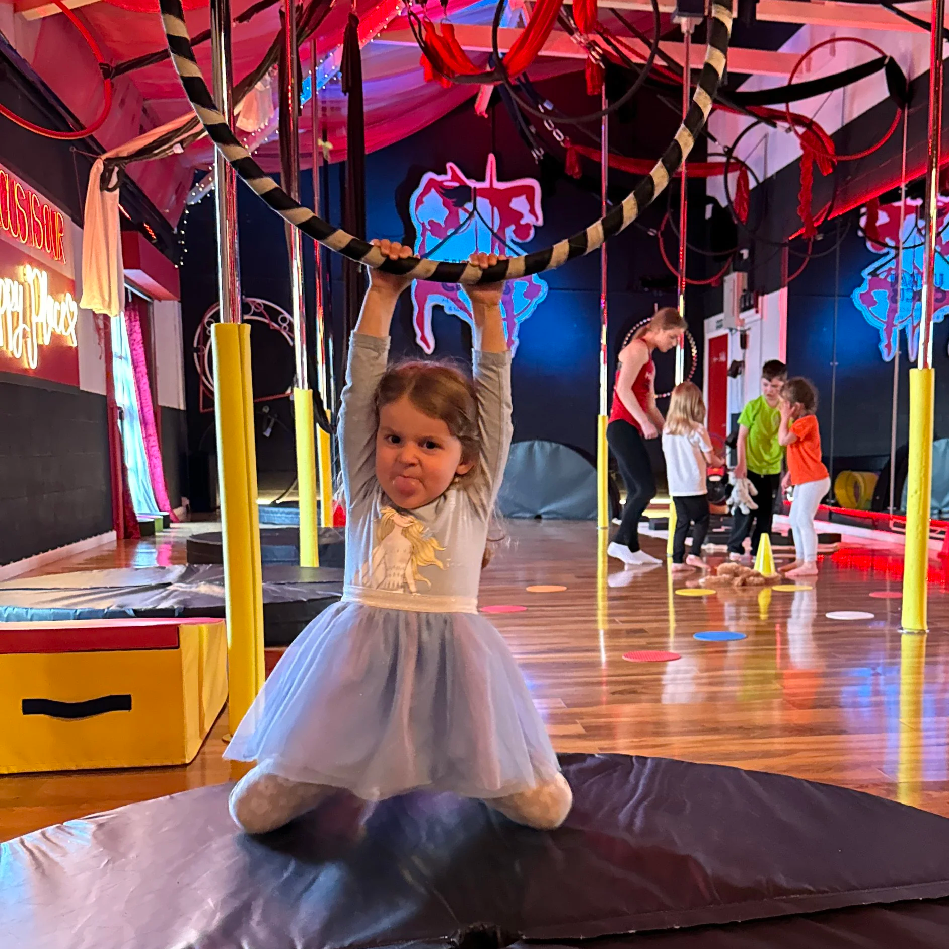 During the party, the studio will be set with various soft play equipment including a ball pit, a slide, tunnels, stepping stones, foam building blocks, and play structures built from our crash mats (we’re quite proud of how our fort building skills have come on since opening the studio to little ones). There are sensory areas with lights and textures, as well as puzzles and soft toys mixed in for interactive play. There will also be a spinning and static pole, a rope, a hammock and a static trapeze. instructors will be present to welcome your guests, involve them in songs and games, and to advise them of what they might like to do on the equipment. They will also take photos to share with the party organiser so that you can pass them on to your guests (if photo permissions are granted).